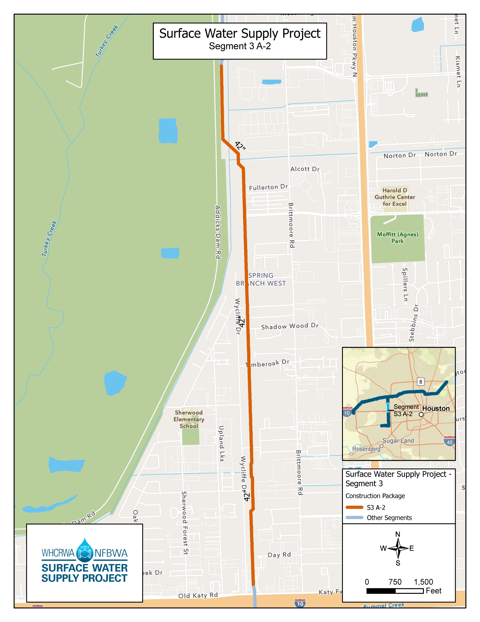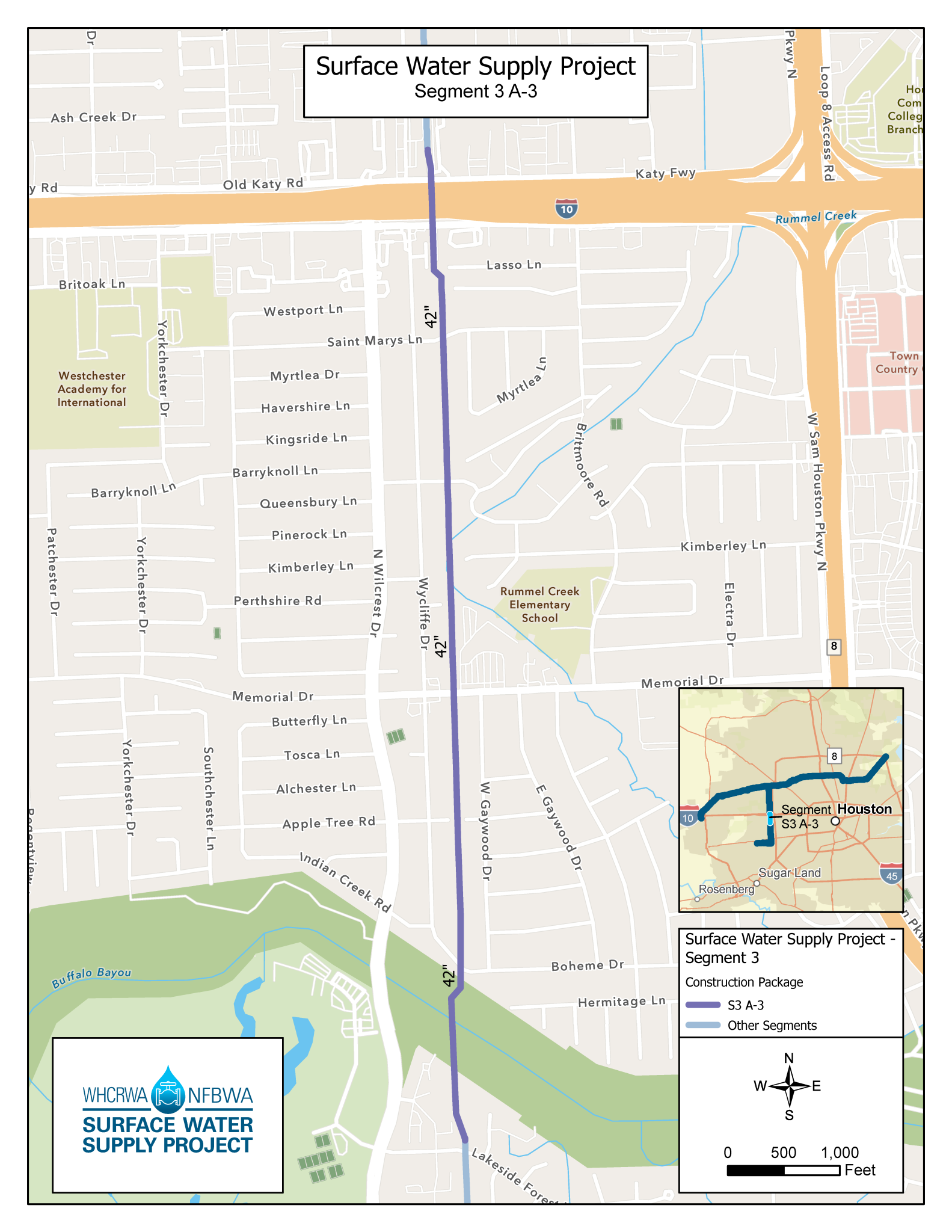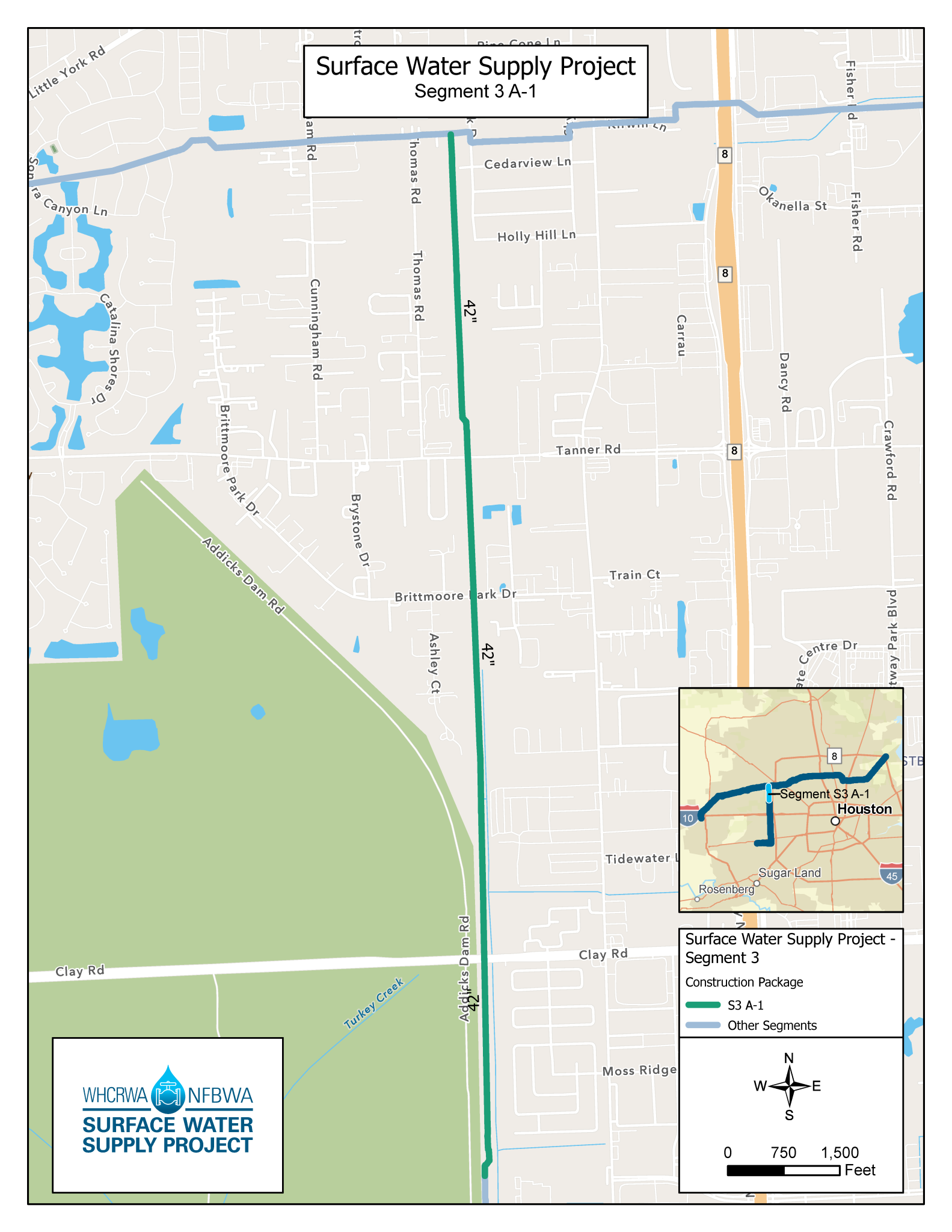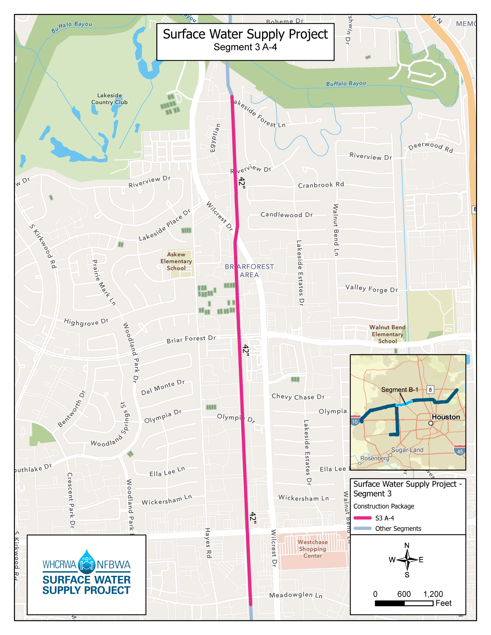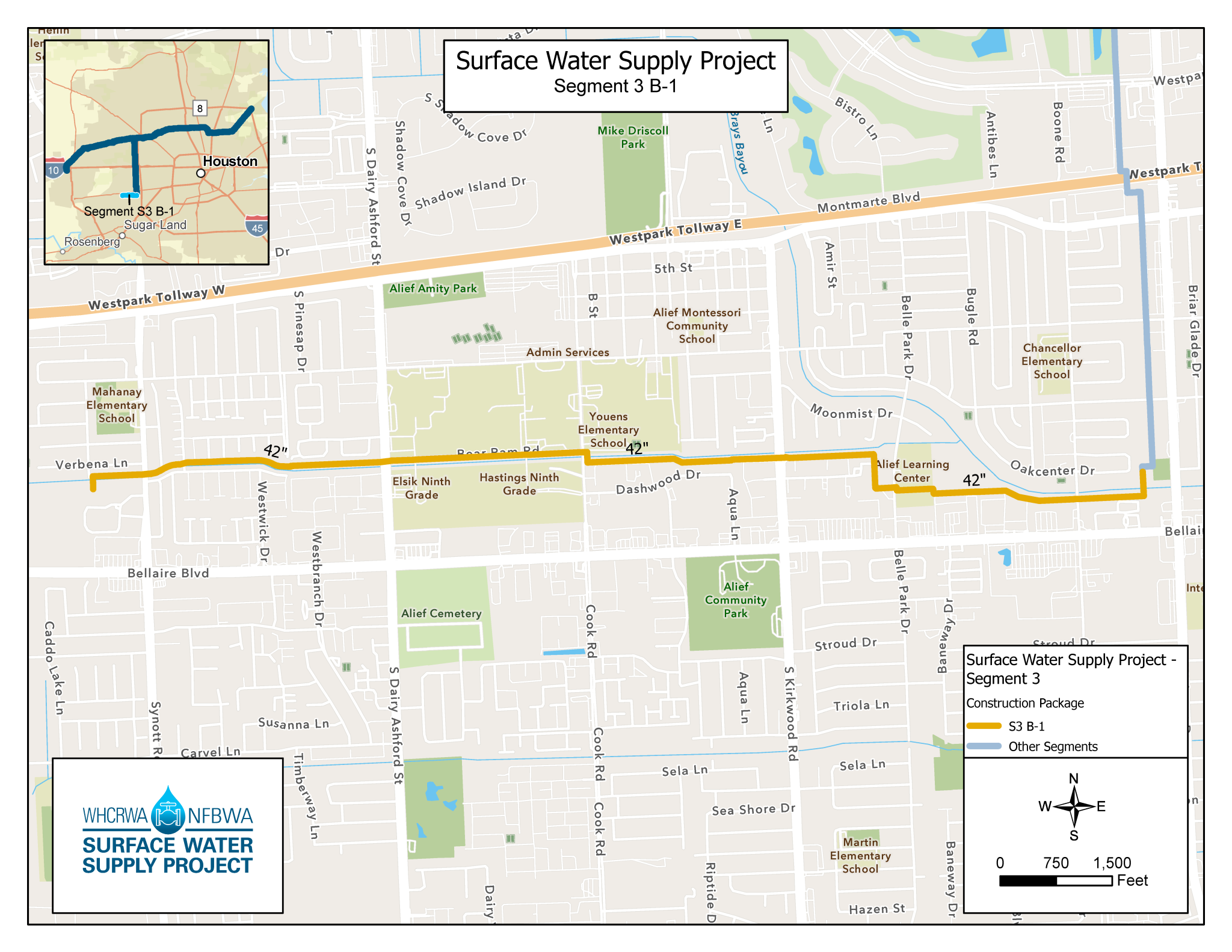 The Segment 3 waterline is a 42-inch waterline that extends approximately 13.8 miles from Segment C (84-inch Waterline) near Brittmoore Road to the NFBWA Bellaire Pump Station along CenterPoint Energy (CPE) easements and some private easements. Segment 3 is being constructed in six separate construction packages.